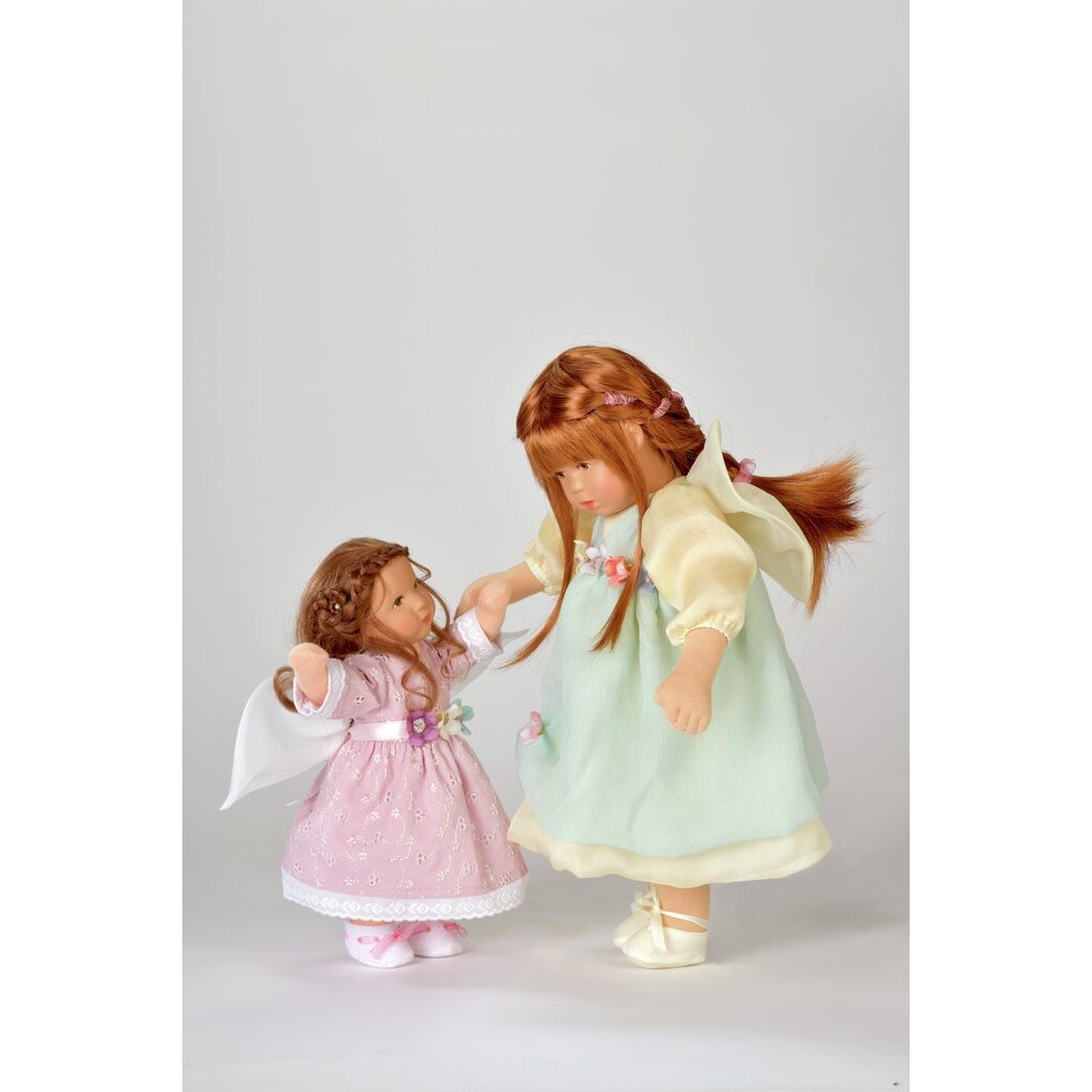 Alette ist eine Käthe Kruse Däumlinchen Puppe. Der Puppenkörper ist 25 cm groß und weich geschäumt. Er ist mit Trikotstoff bezogen und im Inneren befindet sich ein Drahtskelett das die Puppe beweglich macht. Der Kopf ist aus Polysterol gefertigt und künstlerisch von Hand bemalt. Die Augen sind grün. Die braune Echthaarperücke trägt Alette teils geflochten und teils mit offenen Locken frisiert. Bekleidet ist Alette wie eine kleine Fee. Das Kleid ist mit einem hübschen Blütengürtel verziert, die Filzschühchen sind mit einer Schleife gebunden. Ihre Feenflügelchen kann Alette auch abnehmen. Der Name Alette bedeutet "Die Kleine mit den Flügeln". Unsere Sammlerpuppen und Bekleidungen werden handgefertigt und haben eine Lieferzeit von ca. 30 Werktagen.