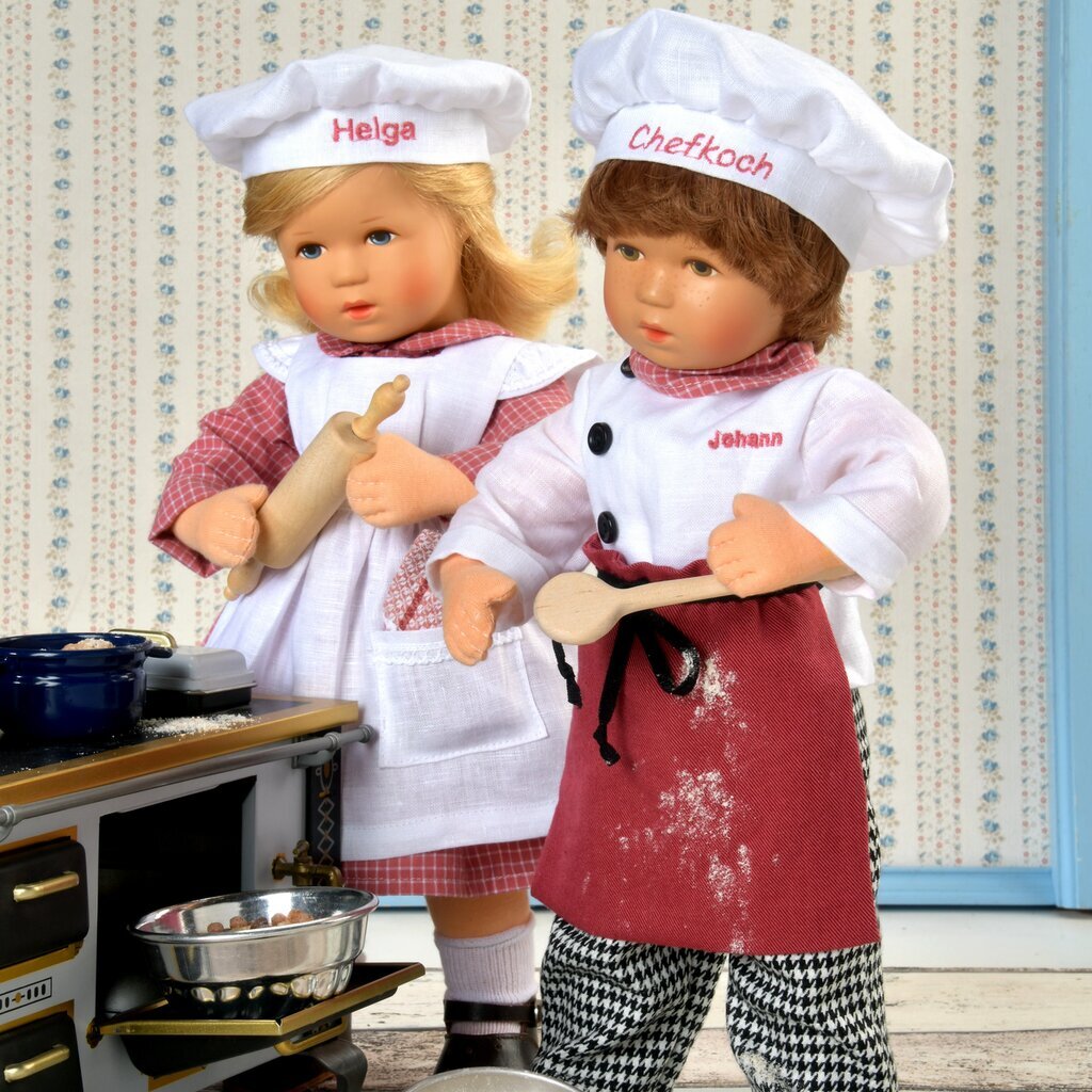 Unsere Sammlerpuppen und Bekleidung werden handgefertigtt und haben eine Lieferzeit von ca. 30 Werktagen. Unsere Bäckerin ist eine 34 cm groß Schummelchen Puppe. Der Körper ist weich geschäumt und mit dem inneren Drahtskelett besonders vielseitig zu dekorieren. Der Polystyrolkopf ist ein handbemalter Rumpumpel Kopf. Unsere Bäckerin können Sie nach der Bestellung noch individualisieren und personalisieren. Dafür erhalten Sie nach der Bestellung eine Email von der Käthe Kruse Manufaktur. Bei der Echthaarperücke haben sie die Auswahl der Farben blond, braun und rot. Bei der Augenfarben können sie zwischen blau, braun und grün wählen. Außerdem besticken wir die Bäckeremütze gerne mit ihrem Wunschnamen. Die Bäckerin bringt ein Nudelholz mit.