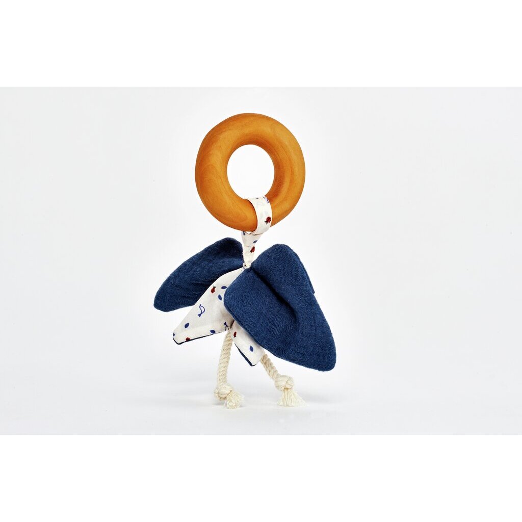Hier gibt es viel zu entdecken: Dieser Greifling lädt mit seinem farbenfrohen original Käthe Kruse Bauernhof-Print zum Anfassen und Festhalten ein. An dem glatten Kirschbaumholzring hängt ein kleines, knisterndes Glöckchen aus weicher Baumwolle und Musselin. Das Blatt aus Baumwollmusselin rundet das Design gekonnt ab. Dank der unterschiedlichen Materialien bleibt der Greifling lange interessant.