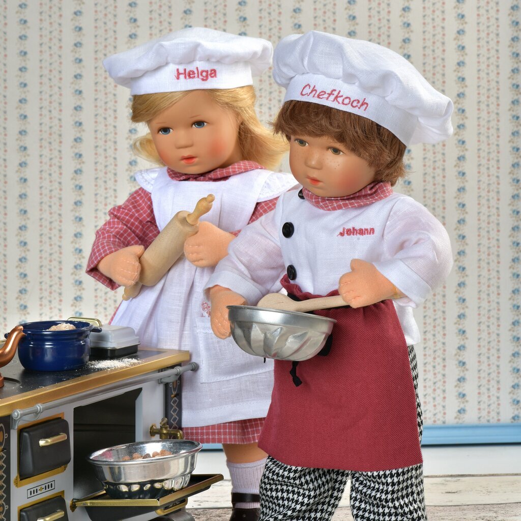 Unsere Sammlerpuppen und Bekleidung werden handgefertigtt und haben eine Lieferzeit von ca. 30 Werktagen. Unser Chefkoch ist eine 34 cm groß Schummelchen Puppe. Der Körper ist weich geschäumt und mit dem inneren Drahtskelett besonders vielseitig zu dekorieren. Der Polystyrolkopf ist ein handbemalter Rumpumpel Kopf. Unseren Chefkoch können Sie nach der Bestellung noch individualisieren und personalisieren. Dafür erhalten Sie nach der Bestellung eine Email von der Käthe Kruse Manufaktur. Bei der Echthaarperücke haben sie die Auswahl der Farben blond, braun und rot. Bei der Augenfarben können sie zwischen blau, braun und grün wählen. Außerdem besticken wir die Kochjacke gerne mit ihrem Wunschnamen. Der Chefkoch bringt einen Holzkochlöffel mit.