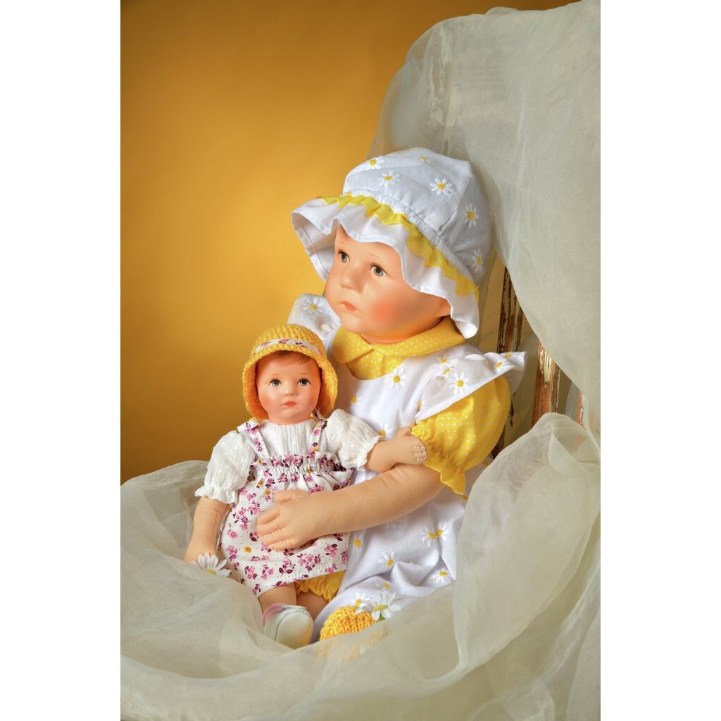 Mit Flora feiern wir den 100. Geburtstag des Puppentyps Du Mein. Dieser Puppentyp wurde von Käthe Kruse erstmals im Jahr 1925 gefertigt. Flora ist mit 50 cm so groß wie ein Säugling. Der Puppenkörper ist aufwendig mit Reh- und Rentierhaar von Hand gestopft. Der Kopf der Puppe ist aus hochwertigem Vinyl gefertigt. Das wunderschöne Babygesicht mit grau-blauen Augen und feinem Haar ist künstlerisch von Hand gemalt. Flora trägt eine hübsche gelbe Tupfenbluse und darüber ein weißes Kleid, das mit Margaritenblüten verziert ist. Passend zur Bekleidung trägt Flora eine Mütze, helle Strumpfhosen und gelbe handgestrickte Schuhe. Unsere Sammlerpuppen und Bekleidungen werden handgefertigt und haben eine Lieferzeit von ca. 30 Werktagen.