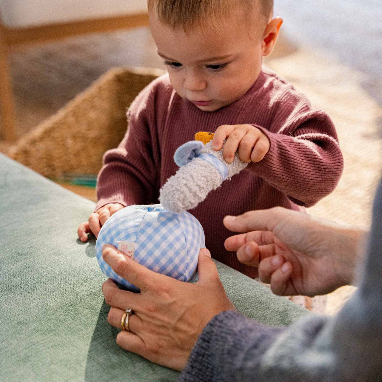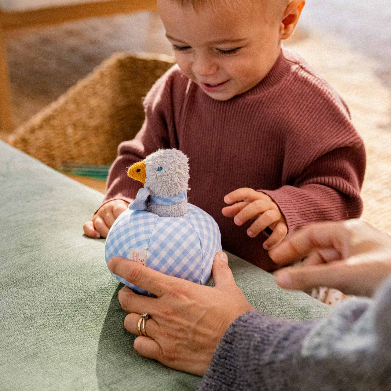 Wer hat Ebba gesehen? Die kleine Ente versteckt sich in einem weichen Ball aus karierter Baumwolle und dient als Greifling. Kleine Finger können sie aus dem Ball herausziehen oder wieder darin verschwinden lassen – perfekt für erste Steckspiele. Ebba ist aus Baumwollfrottee und verfügt über eine wunderschöne Musselinschleife, die das Zupacken durch kleine Hände erleichtert. Wird Ebba hochgenommen und bewegt, überrascht sie mit einem sanften Rasseln.
