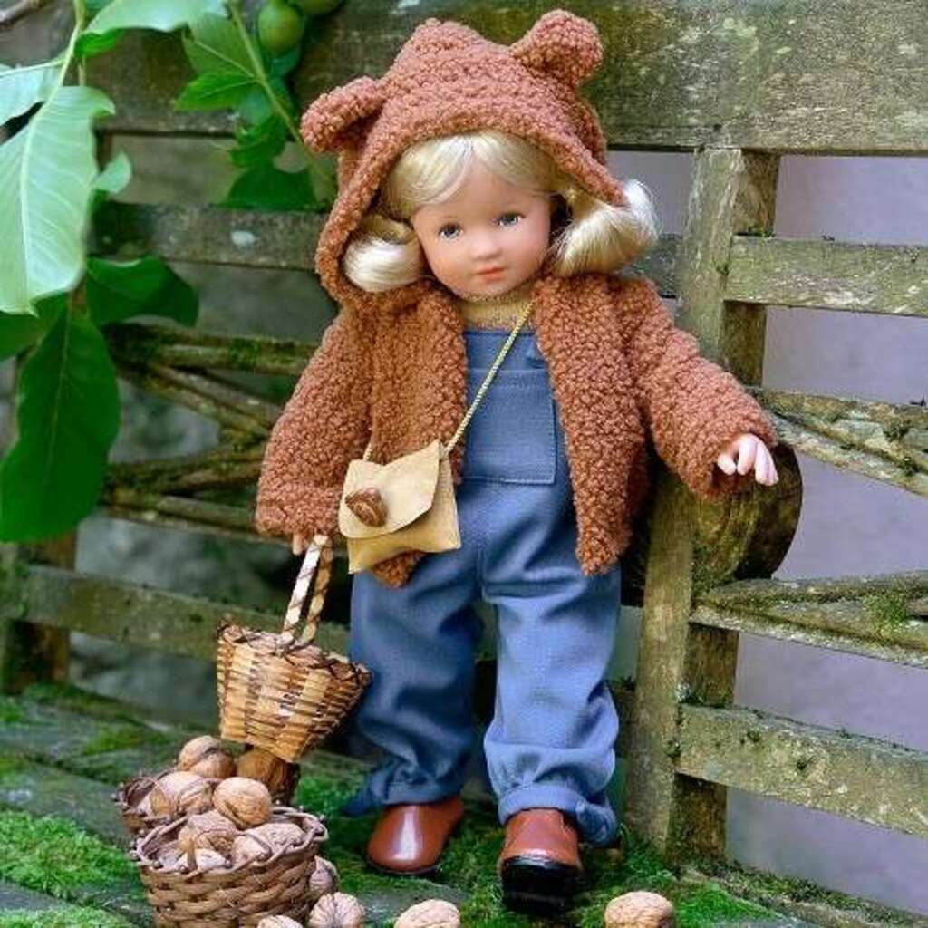Unsere Sammlerpuppen und Bekleidung werden handgefertigt und haben eine Lieferzeit von ca. 30 Werktagen. Elin ist eine 39 cm große Glückskind Puppe. Der Körper ist weich und aus Stoff gefertigt. Die Arme, die Beine und der Kopf sind aus hochwertigem Vinyl gefertigt. Das liebe Gesicht ist von Hand bemalt, Elins Augen strahlen in einem hübschen Blau. Die Kunsthaarperücke trägt Elin zu seitlichen Pferdeschwänzen frisiert. Elins Bekleidung ist herbstlich und sie freut sich auf einen Spaziergang durch den Wald. Sie trägt eine blaue Latzhose und darunter einen Pullover. Die Jacke aus weichem Teddystoff hat eine Mütze mit lustigen Bärenohren. Elin trägt eine Tasche über der Schulter und braune Stiefel.