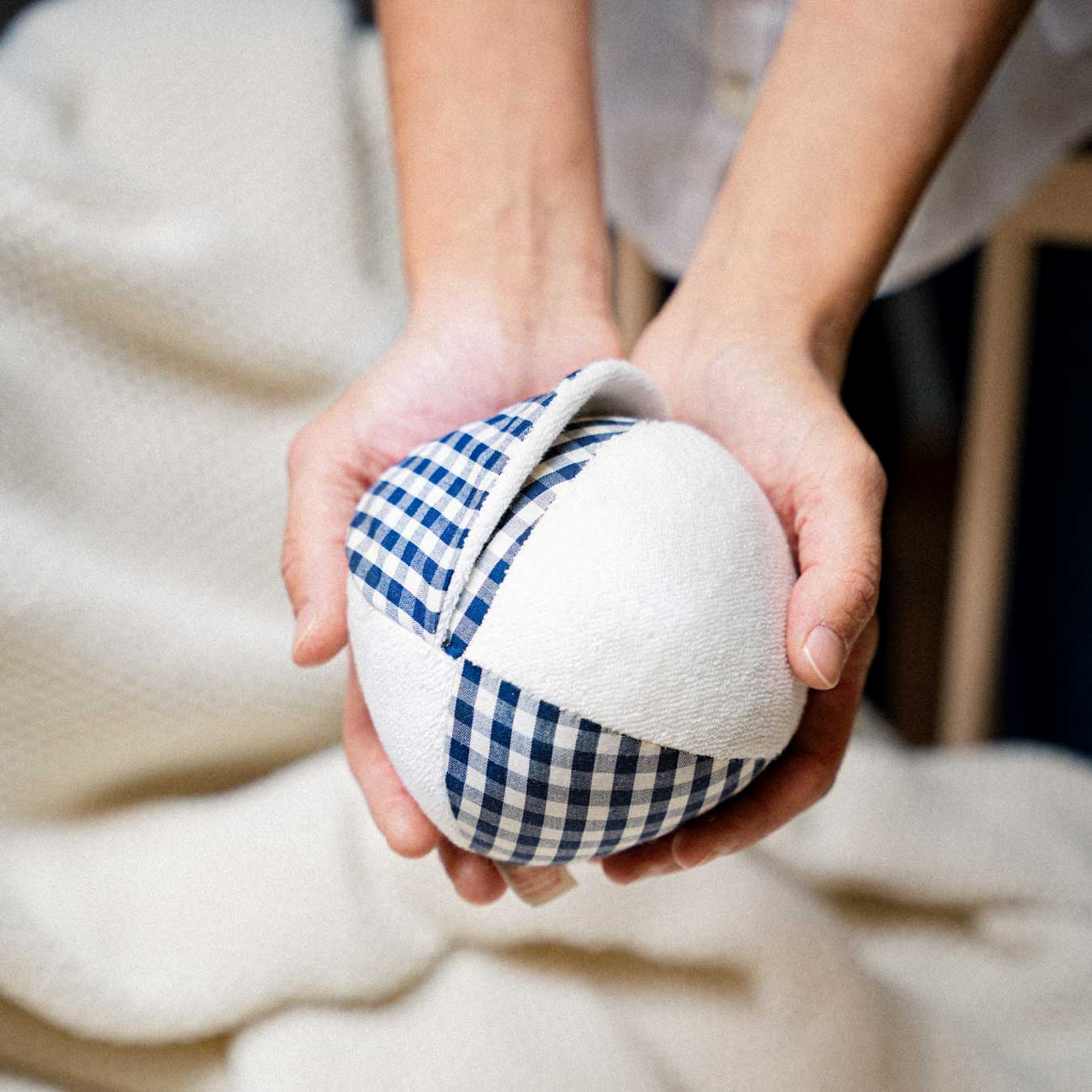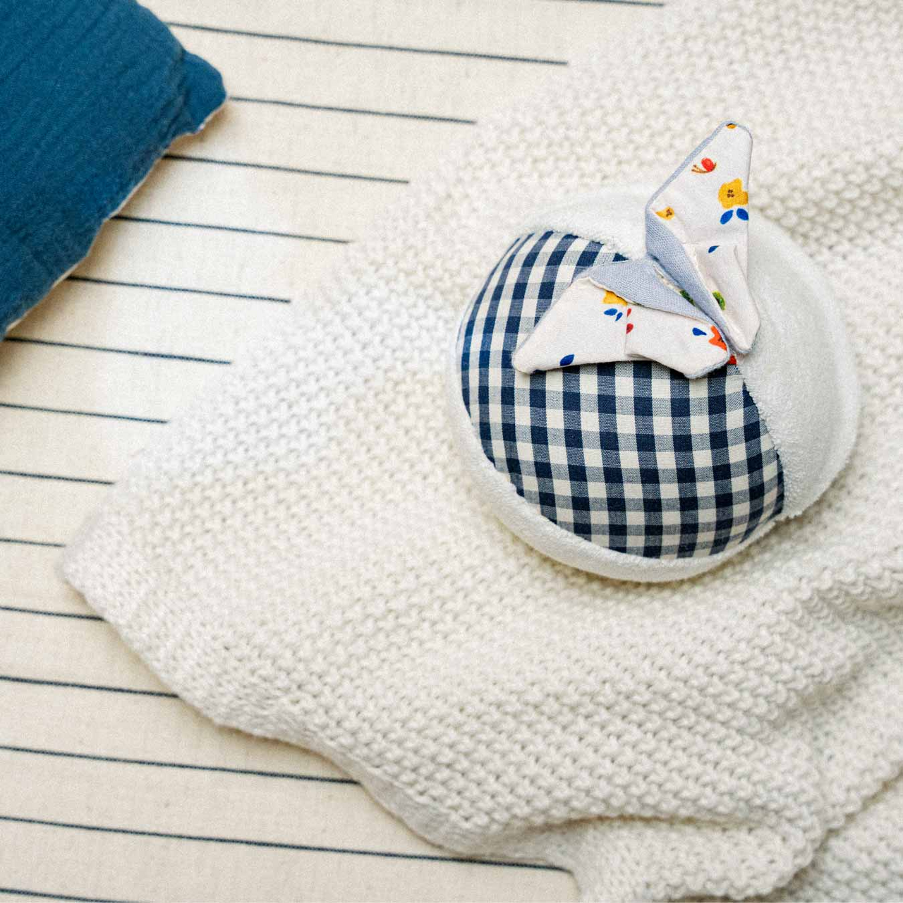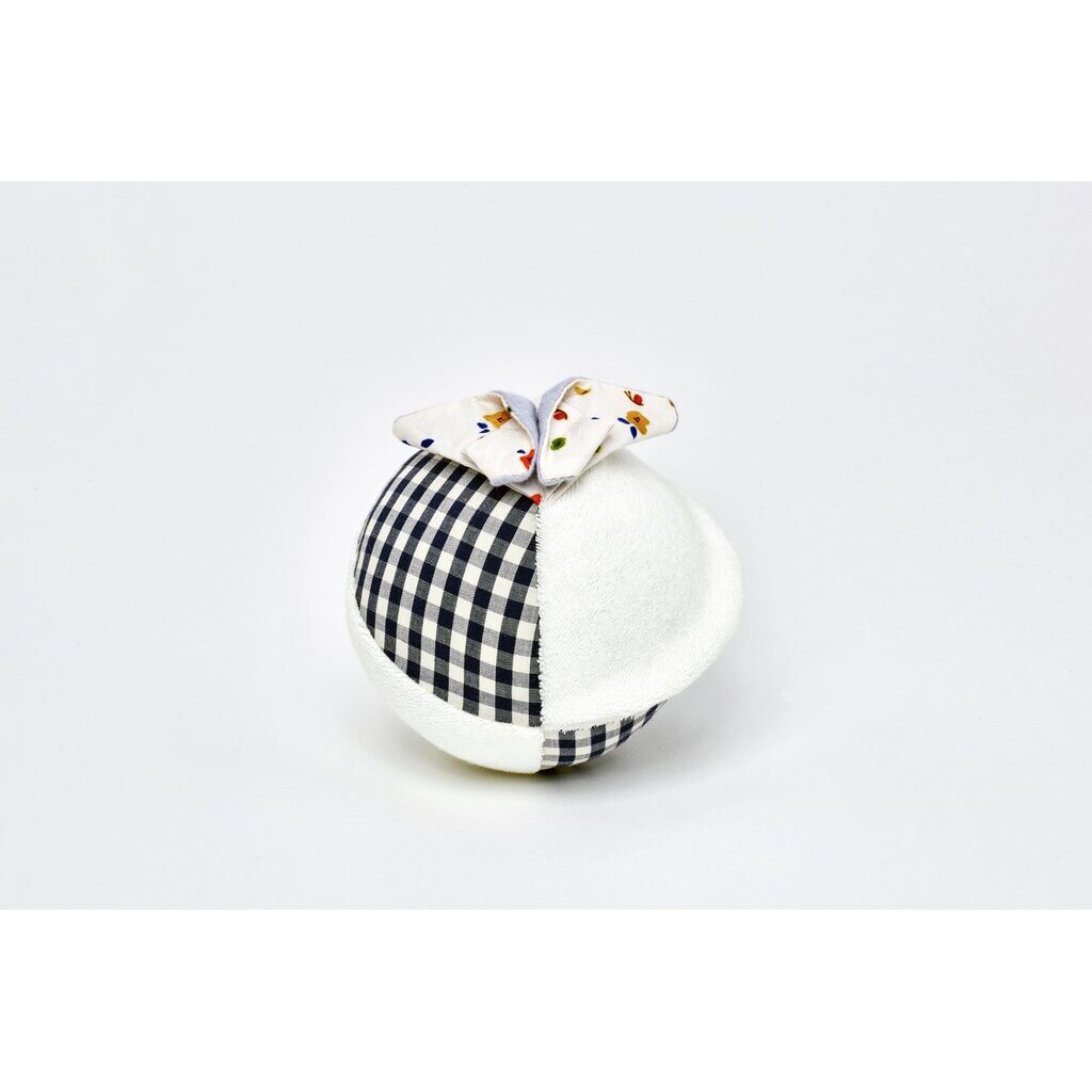 Lass uns Verstecken spielen! Auf dem leichten, mit Knisterfolie gefüllten, Aktivitätsball sitzt ein farbenfroher Origami-Falter, der sich kinderleicht im Inneren des Balls verstecken lässt. Der Plüschball selbst ist mit weicher Baumwolle bezogen und verfügt über ein Glöckchen im Inneren. Wenn der Falter eingeklappt ist, rollt der Ball kinderleicht. Er kann auch gut für erste Werf- und Fangspiele im Kinderzimmer genutzt werden.