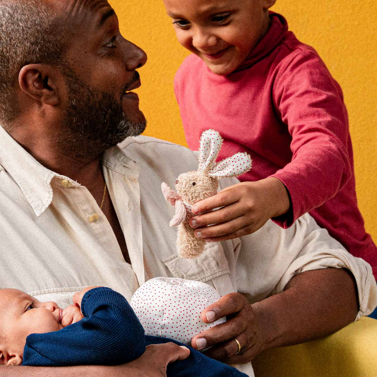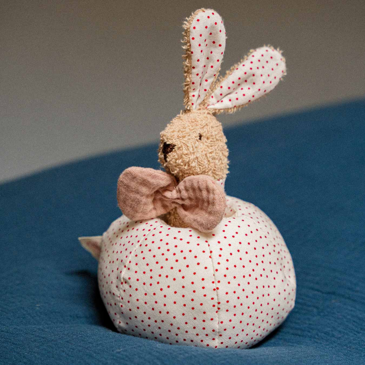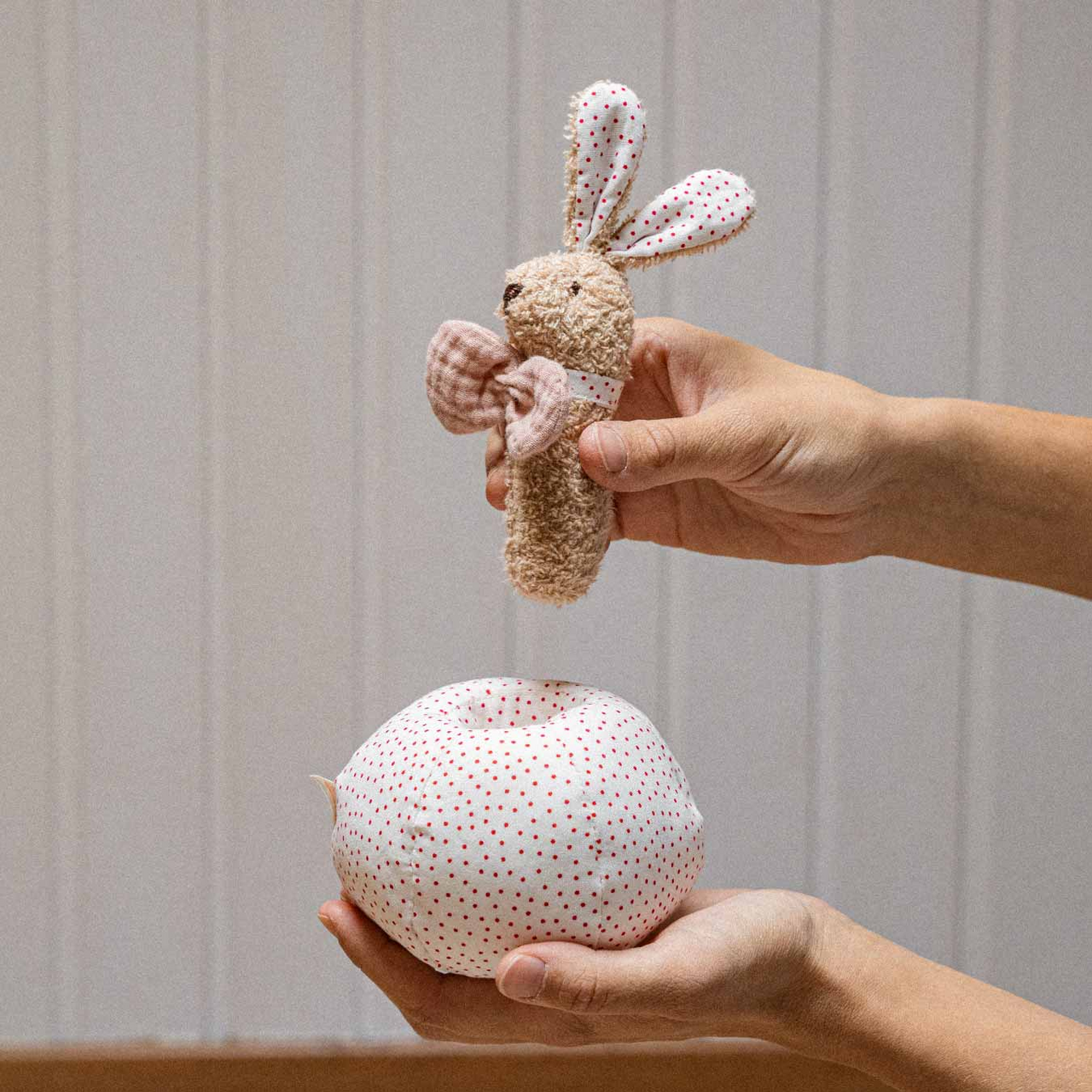 Guck-guck! Wer ist denn da? Das ist Holly Hase, die frech aus ihrem Ball heraus schaut. Sie ist Steckspiel, Ball und Rassel zugleich. Der weiche Ball aus gepunkteter Baumwolle lässt sich selbst von den Allerkleinsten gut halten. In ihm versteckt sich die kleine Hasendame Holly, die neugierig darauf wartet, entdeckt zu werden. Holly ist eine Rassel aus sanftem Frottee und verfügt über eine Musselinschleife für leichtes Zugreifen.