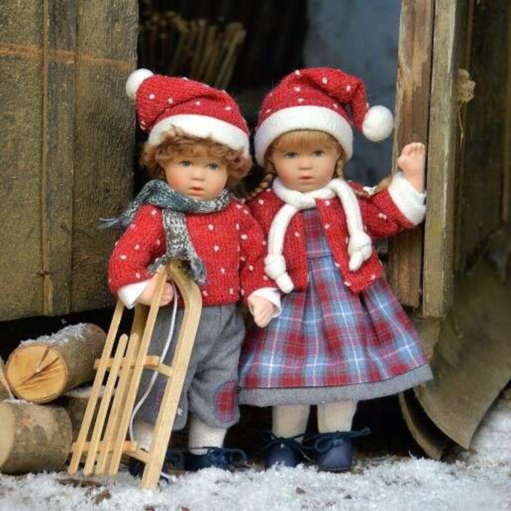 Unsere Sammlerpuppen und Bekleidung werden handgefertigt und haben eine Lieferzeit von ca. 30 Werktagen. Jonah ist eine 34 cm große Schummelchen Puppe. Der Körper ist weich geschäumt und hat im Inneren ein bewegliches Drahtskelett. Der Kopf ist aus Polysterol gefertigt und liebevoll von Hand bemalt. Jonahs Augen sind strahlend blau. Die mittelbraune Echthaarperücke trägt Jonah zu einem frechen kurzen Lockenkopf frisiert. Jonah ist winterlich bekleidet und trägt eine graue Flanellhose. Der rote Strickpullover und die passende Zipfelmütze sind mit lustigen weißen Tupfen verziert. Blaue Lederschuhe und ein Strickschal komplettieren das hübsche Winteroutfit.