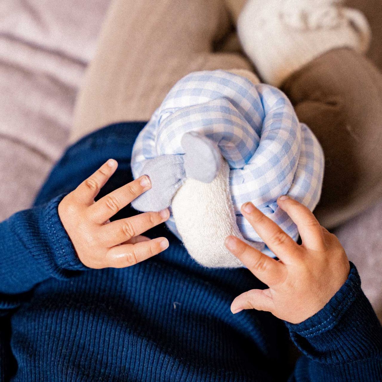 Komm, spiel mit mir! Der moderne Knotenball mit Glocke kann von kleinen Fingern gut gegriffen, gedreht und erkundet werden. Dabei ist er so leicht, dass er sich auch gut halten lässt. Durch den weichen Stoff kann er auch für erste Wurf- und Ballspiele verwendet werden. Mit seinem Design aus hellblauem Karostoff und einer Schleife aus Baumwollmusselin bringt er kleine Augen zum Leuchten. Gefertigt ist der Ball aus ineinander verknoteten Ringen aus weichem Strickfrotee.