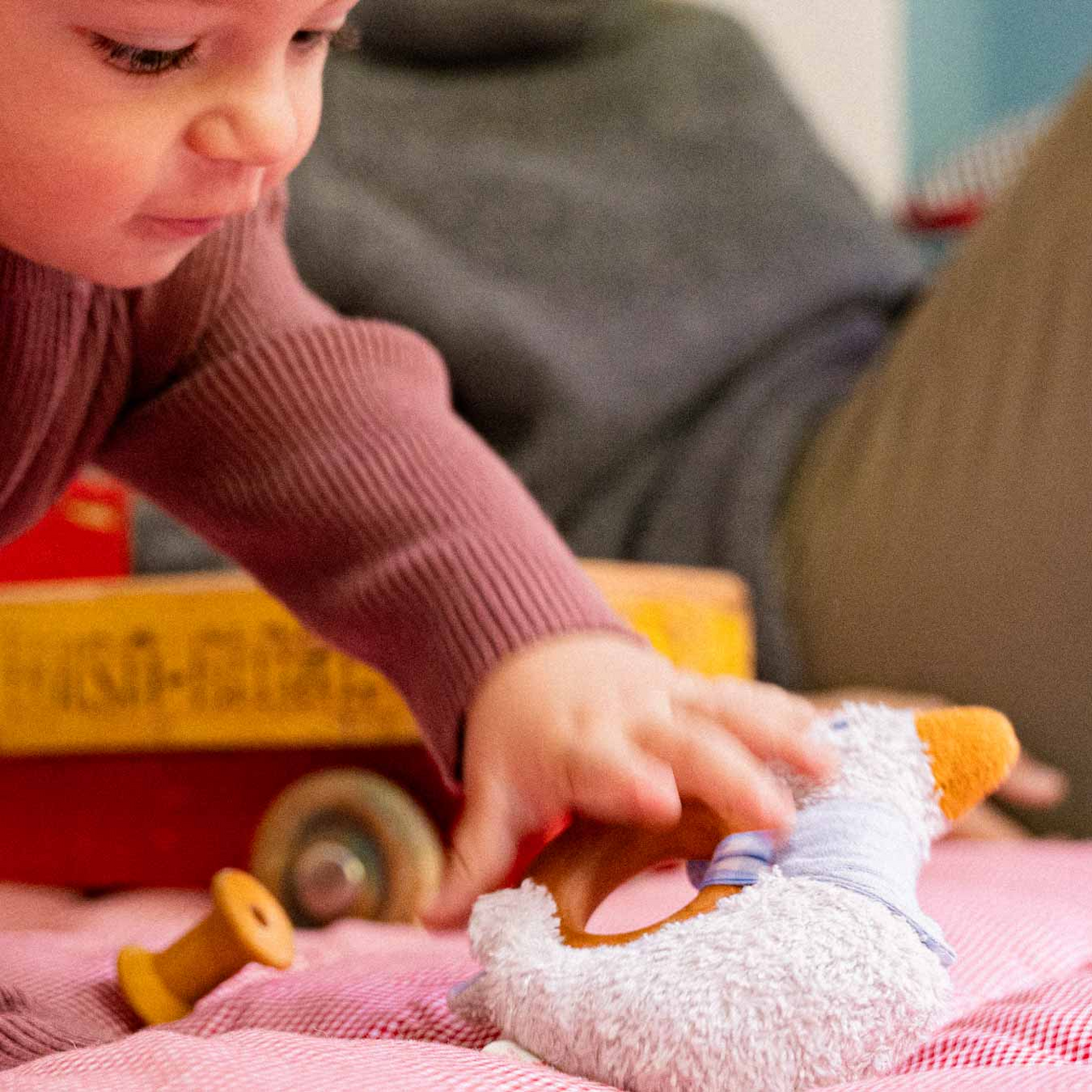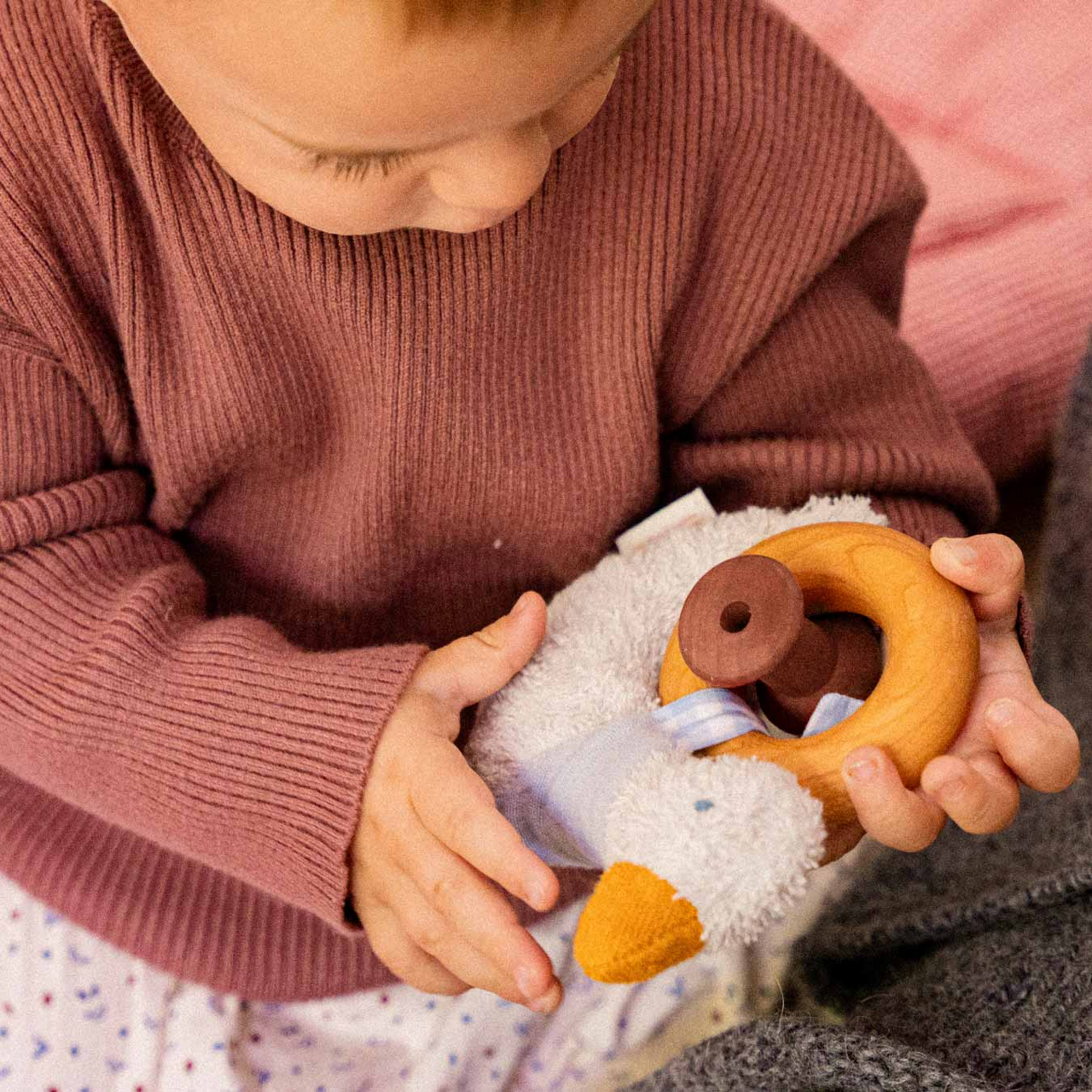 Klein und süß: Hier kommt die niedliche Ente ins Kinderzimmer geflattert. Sie hat ein Halsband an, mit dem sie an einem Kirschbaumholzring befestigt ist. Damit sie die Allerkleinsten durch den Alltag begleiten kann, lässt sie sich auch ganz leicht losmachen und woanders befestigen. Außerdem rasselt die Ente leise, wenn sie von kleinen Händchen gegriffen und bewegt wird.