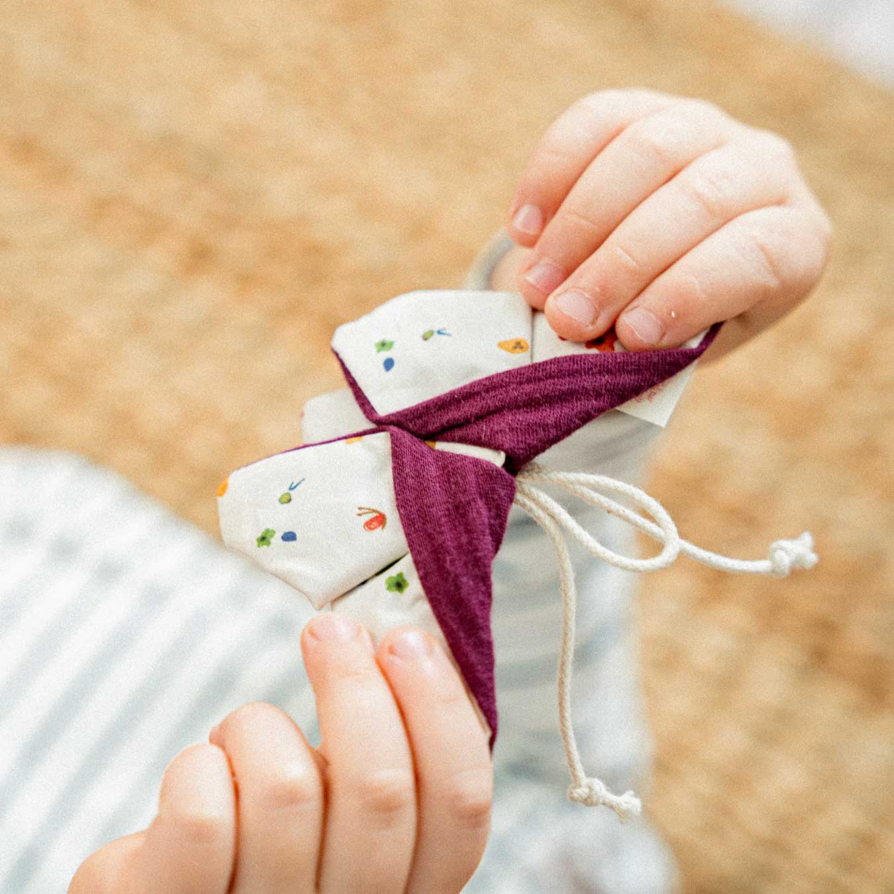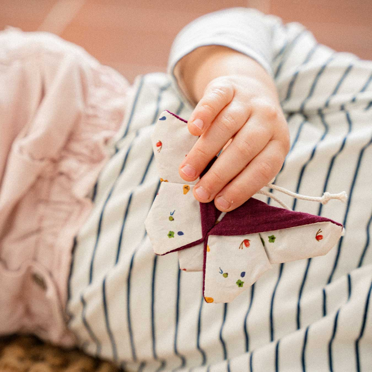 Ein wunderschöner Blickfang in jedem Kinderzimmer: Der Origami-Knister-Schmetterling begeistert mit original Käthe Kruse Wald-Print auf den Flügeln und einem weichen bordeauxfarbenen Bauch. Der weiche Stoff macht ihn zu einem besonderen Begleiter im Kinderwagen und die Knisterfolie im Inneren regen kleine Hände und Ohren zum Erkunden an. Die Fühler des farbenfrohen Schmetterlings sind aus Baumwollkordel und mit einem Knoten versehen – perfekt zum Tasten und Greifen.