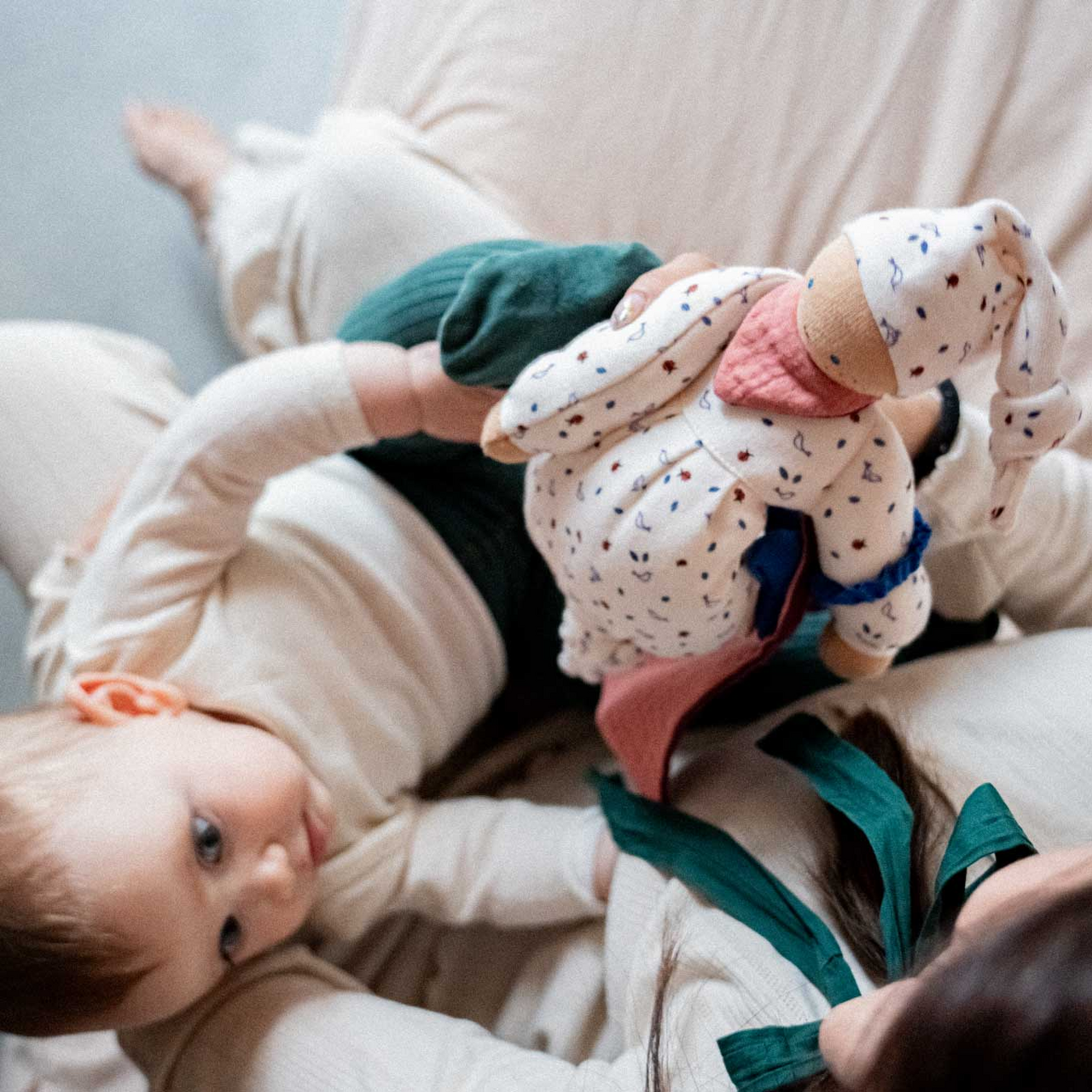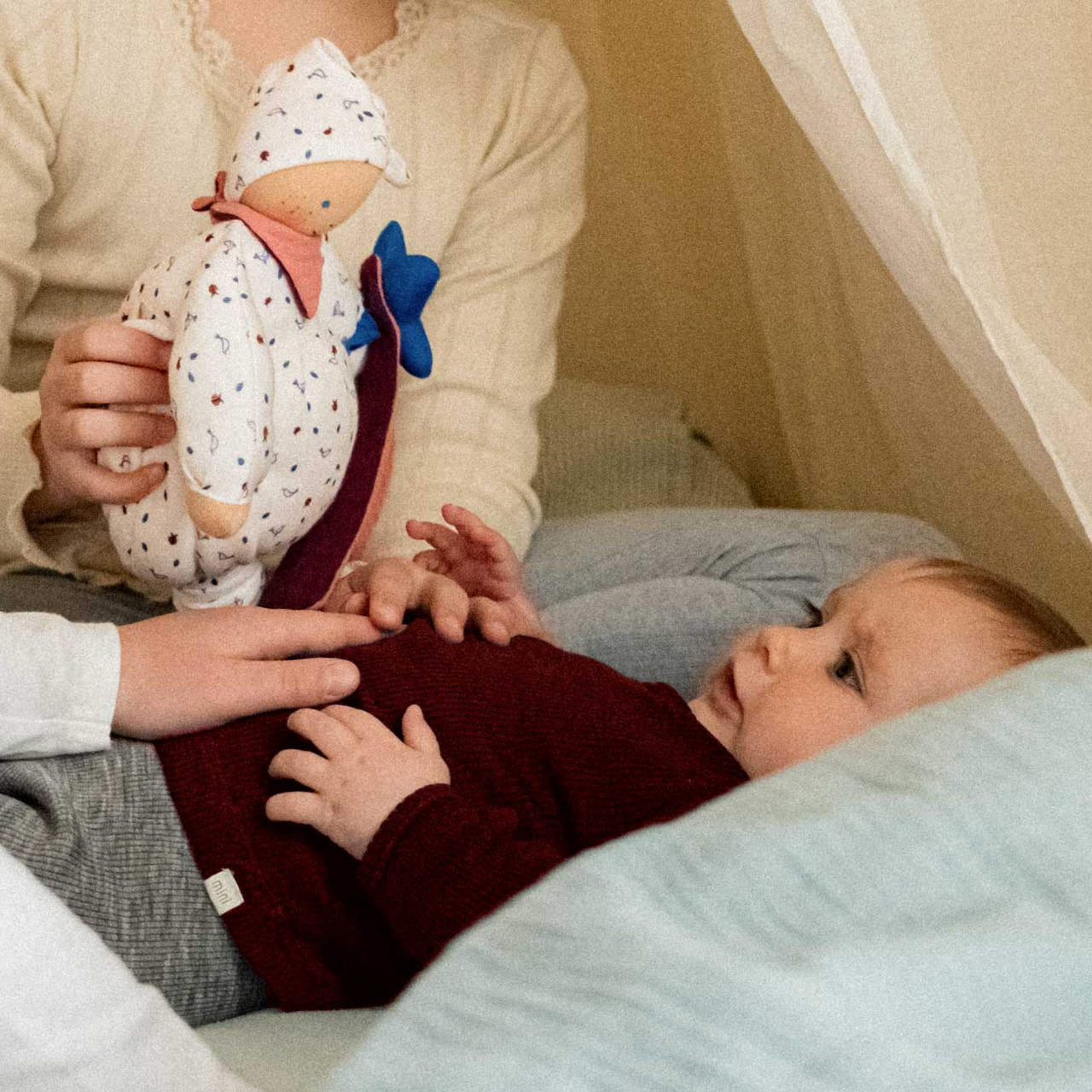 Die Käthe Kruse-Stoffpuppe in wunderschönem Käthe Kruse-Bauernhofprint mit hellem Hautton kann ab den ersten Stunden an der Seite deines Kindes sein. Durch ihren weichen Körper eignet sie sich perfekt selbst für kleinste Hände, regt zu ersten Greifversuchen an und kann bedenkenlose mit im Bettchen schlafen.