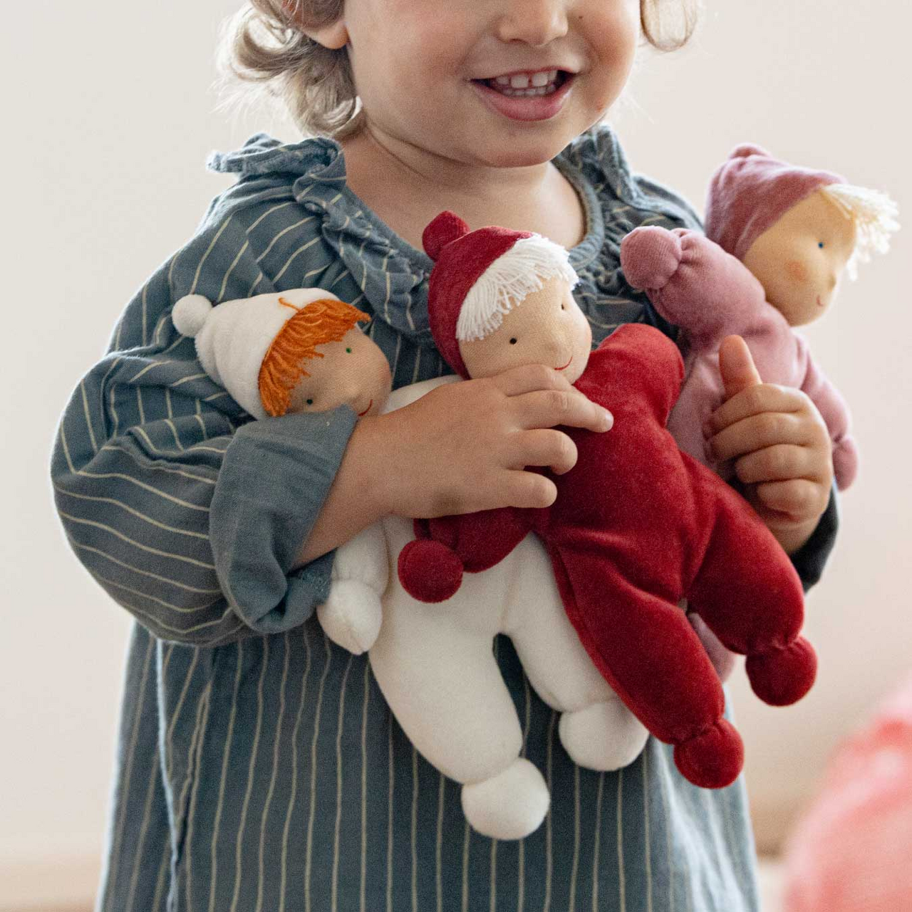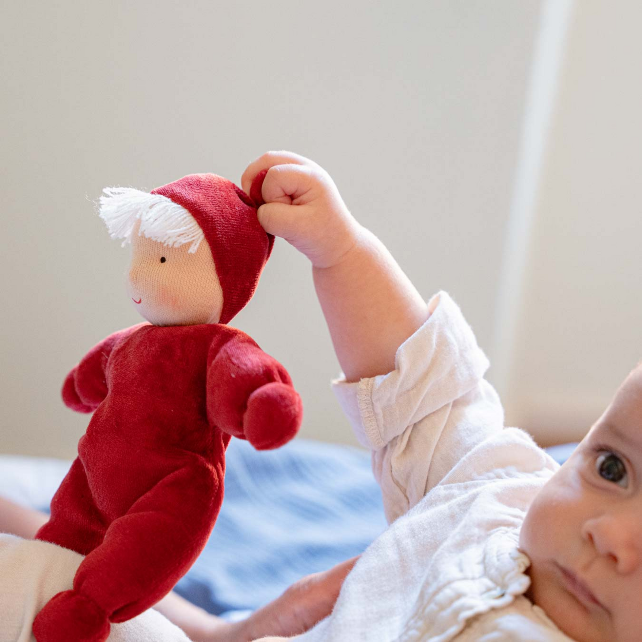- Alle Waldorfpuppen sind aus natürlichen Materialien gefertigt und mit Wolle gefüllt. Wolle ist weich und warm, sollte daher von Hand mit einem Wollwaschmittel gewaschen werden und nie lang im Wasser liegengelassen werden. Die Puppen trocknen am besten an der frischen Luft auf dem Bauch liegend.