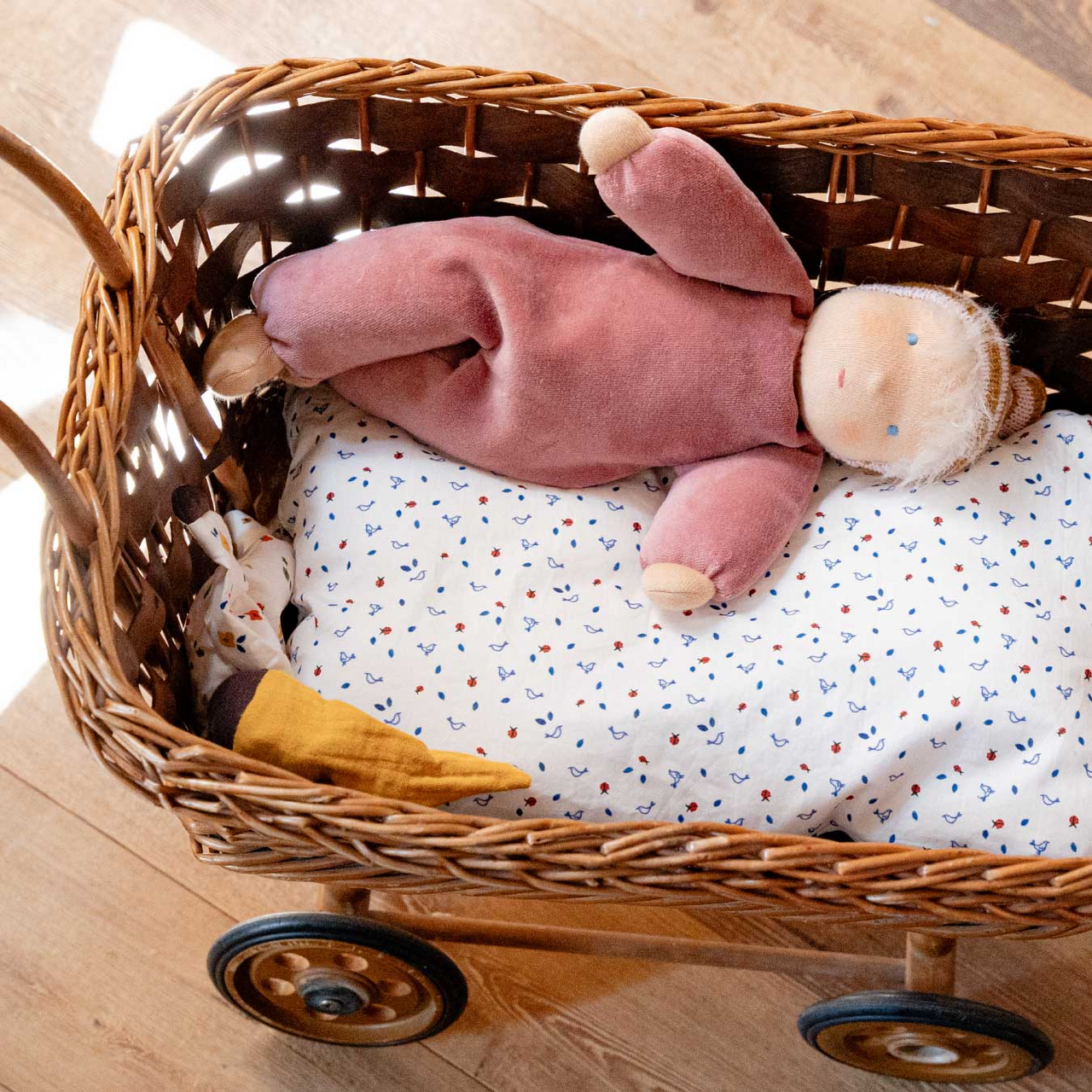 - Alle Waldorfpuppen sind aus natürlichen Materialien gefertigt und mit Wolle gefüllt. Wolle ist weich und warm, sollte daher von Hand mit einem Wollwaschmittel gewaschen werden und nie lang im Wasser liegengelassen werden. Die Puppen trocknen am besten an der frischen Luft auf dem Bauch liegend.